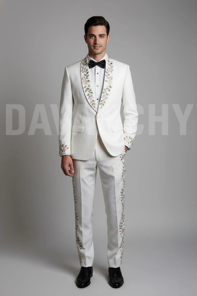 Men white designer two piece suit. Designed with imported premium TR fabric, detailed floral embroidery on the lapel, sleeves, and pants, this suit delivers elegance and sophistication. Ideal for weddings, receptions, red carpet events and destination celebrations. Tailored for comfort and a sharp fit, this designer outfit is perfect for men who want a modern yet timeless statement outfit.