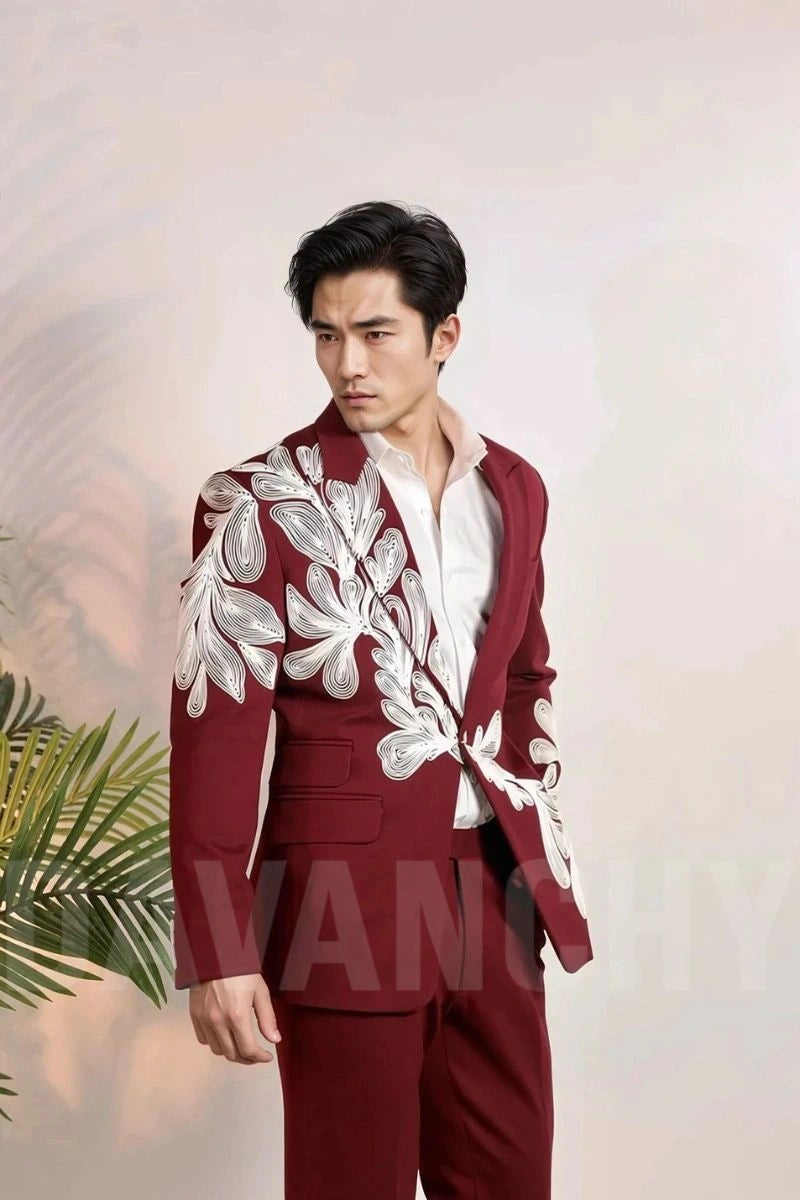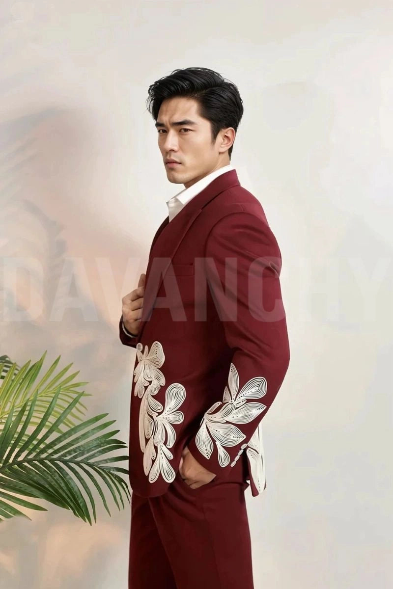 Upgrade your style with our designer embroidered suit for men, crafted from premium imported TR fabric. Perfect for weddings, parties, and galas, this maroon formal suit ensures a sharp, handsome look for any special occasion. Shop now for standout style!